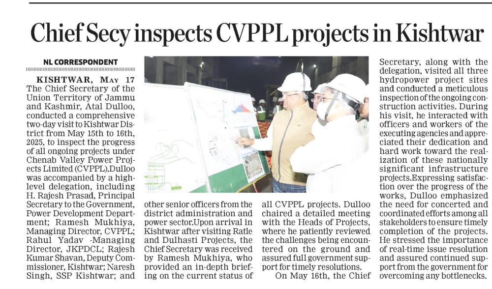 जम्मू-कश्मीर के मुख्य सचिव ने किश्तवाड़ में सीवीपीपीएल परियोजनाओं का निरीक्षण किया, जलविद्युत विकास के लिए सरकार की प्रतिबद्धता की पुष्टि की