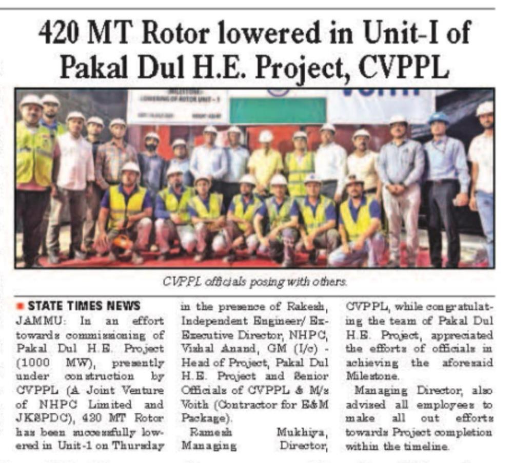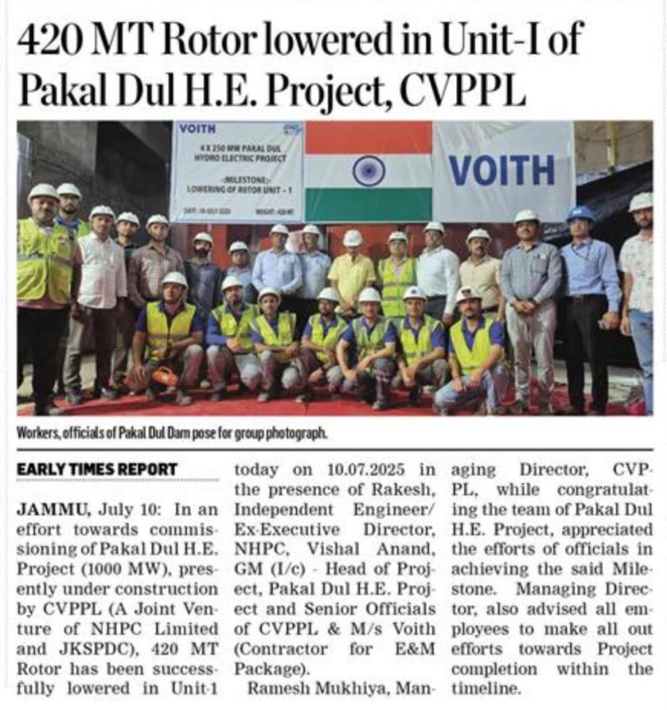 सीवीपीपीएल (एनएचपीसी लिमिटेड और जेकेएसपीडीसी का एक संयुक्त उद्यम) द्वारा वर्तमान में निर्माणाधीन पकल दुल जलविद्युत परियोजना (1000 मेगावाट) को चालू करने के प्रयास में, 10.07.2025 को यूनिट-1 में 420 मीट्रिक टन रोटर को श्री राकेश, स्वतंत्र इंजीनियर/पूर्व कार्यकारी निदेशक, एनएचपीसी, श्री विशाल आनंद, महाप्रबंधक (प्रभारी) - परियोजना प्रमुख, पकल दुल जलविद्युत परियोजना और सीवीपीपीएल एवं मेसर्स वॉयथ (ई एंड एम पैकेज के लिए ठेकेदार) के वरिष्ठ अधिकारियों की उपस्थिति में सफलतापूर्वक उतारा गया।