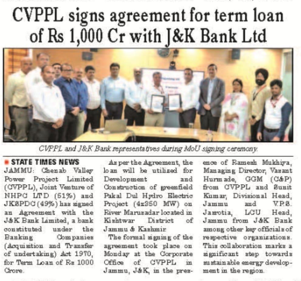 CVPPL signs agreement for term loan of Rs. 1,000 Crore with J&K Bank Ltd.