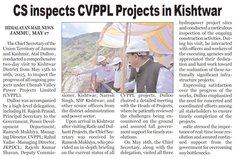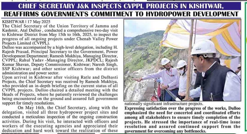 जम्मू-कश्मीर के मुख्य सचिव ने किश्तवाड़ में सीवीपीपीएल परियोजनाओं का निरीक्षण किया, जलविद्युत विकास के लिए सरकार की प्रतिबद्धता की पुष्टि की