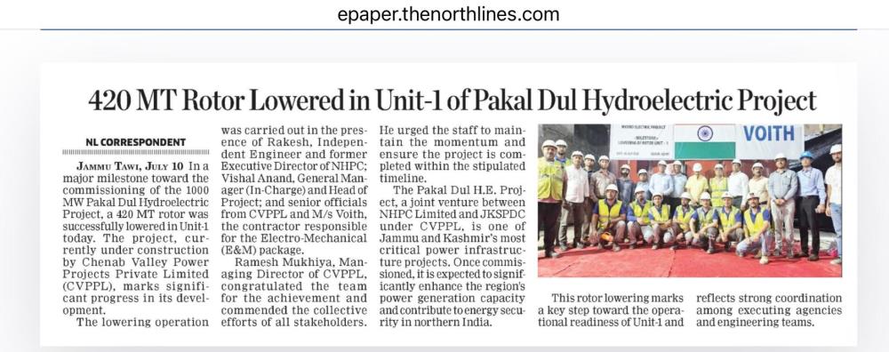 सीवीपीपीएल (एनएचपीसी लिमिटेड और जेकेएसपीडीसी का एक संयुक्त उद्यम) द्वारा वर्तमान में निर्माणाधीन पकल दुल जलविद्युत परियोजना (1000 मेगावाट) को चालू करने के प्रयास में, 10.07.2025 को यूनिट-1 में 420 मीट्रिक टन रोटर को श्री राकेश, स्वतंत्र इंजीनियर/पूर्व कार्यकारी निदेशक, एनएचपीसी, श्री विशाल आनंद, महाप्रबंधक (प्रभारी) - परियोजना प्रमुख, पकल दुल जलविद्युत परियोजना और सीवीपीपीएल एवं मेसर्स वॉयथ (ई एंड एम पैकेज के लिए ठेकेदार) के वरिष्ठ अधिकारियों की उपस्थिति में सफलतापूर्वक उतारा गया।